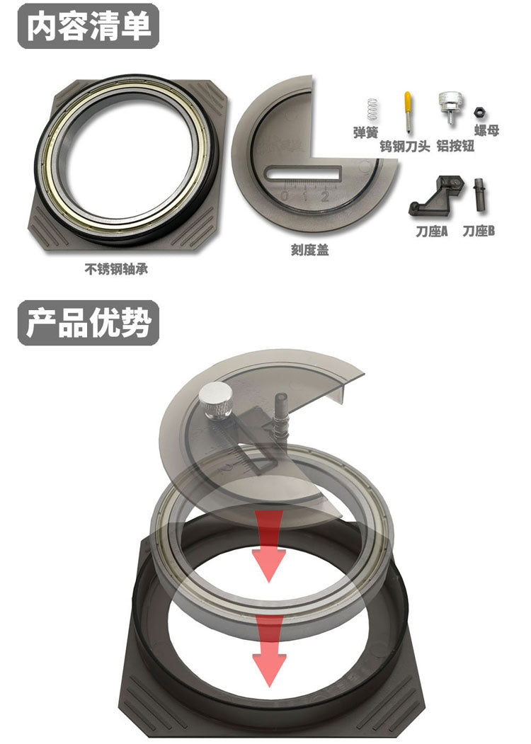 This tool was created with the simple purpose of helping you make perfectly round cuts. Just adjust the locking bolt to the desired diameter, place the cutting blade in position, and start cutting perfect circles!