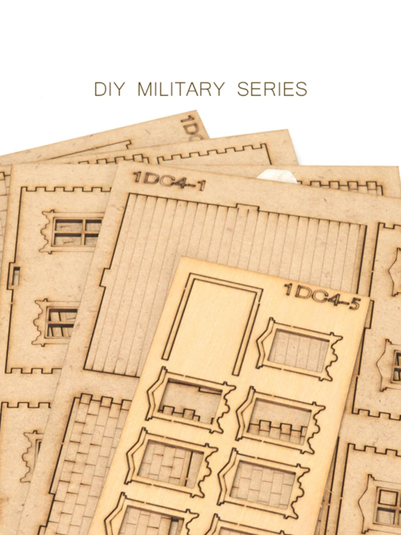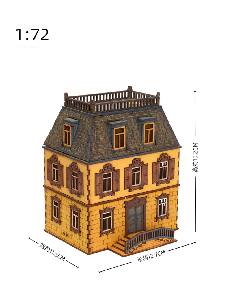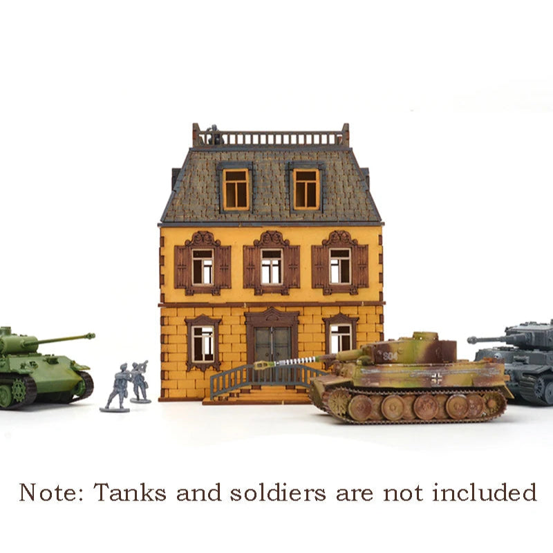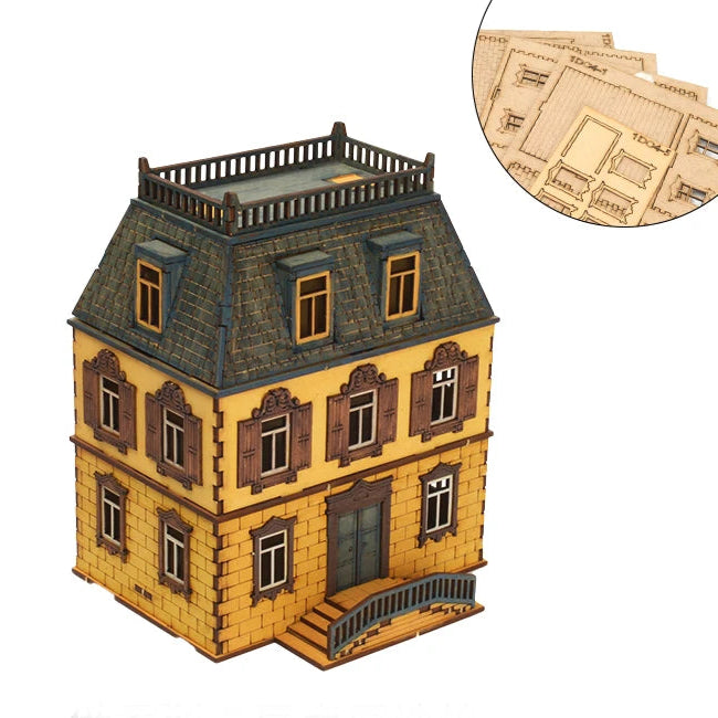 Excellent wooden model kit of a two-story European mansion with an attic, perfect for military dioramas.