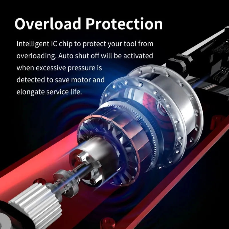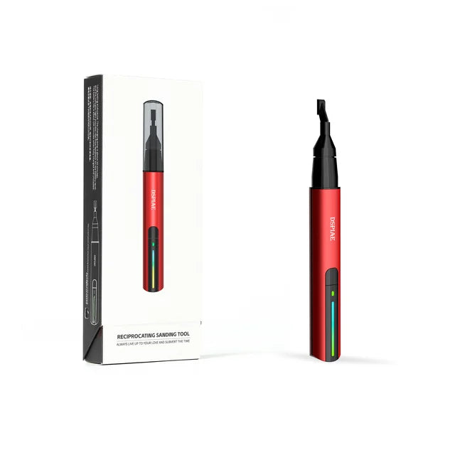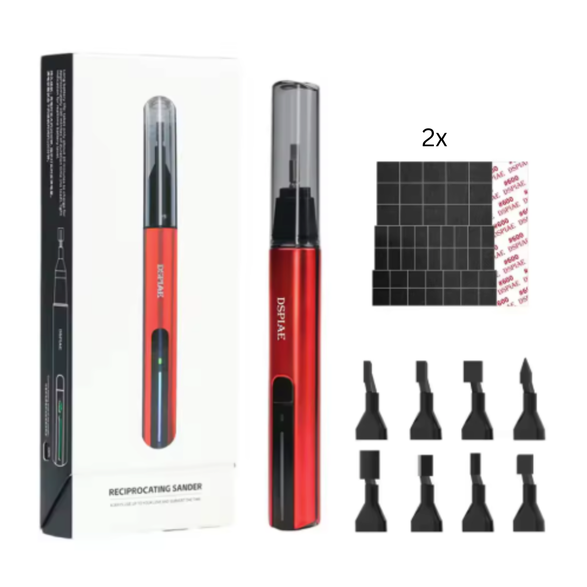 It is a reciprocating sander featuring several heads of different shapes. It allows you to sand parts you cannot easily do with rotary tools—and, of course, much more conveniently than with sanding sticks.