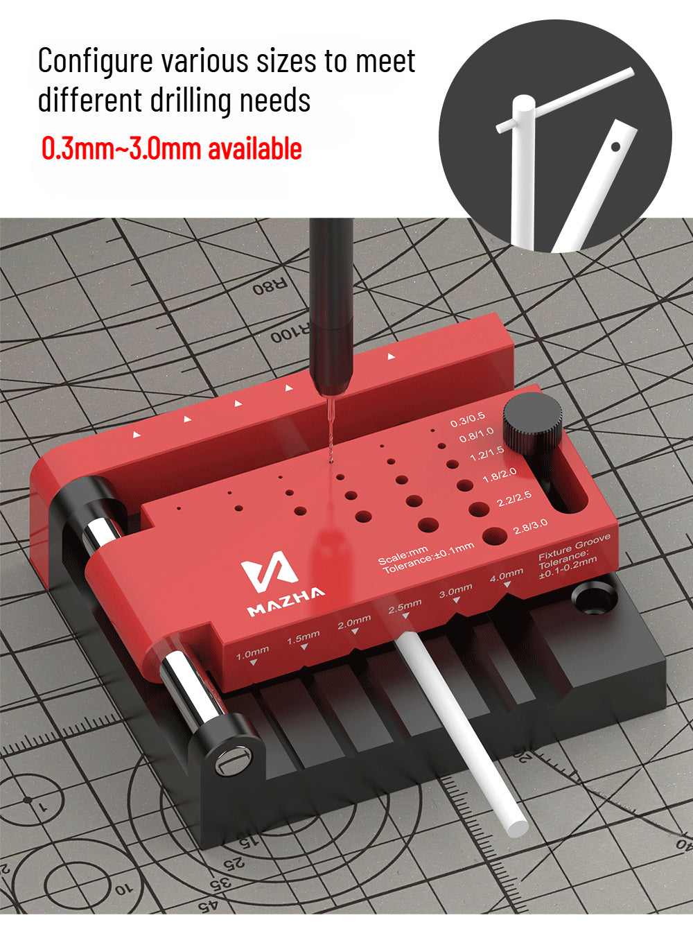 The vise-like mechanism can hold the element to be drilled in position, and then any of the orifices can guide the drill bit.