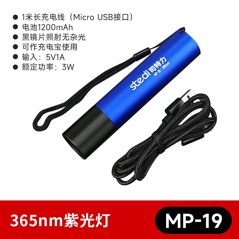 This small torch made by Stedi, projecting a 365nm light beam is ideal for that. I can be charged via Micro-USB 3.